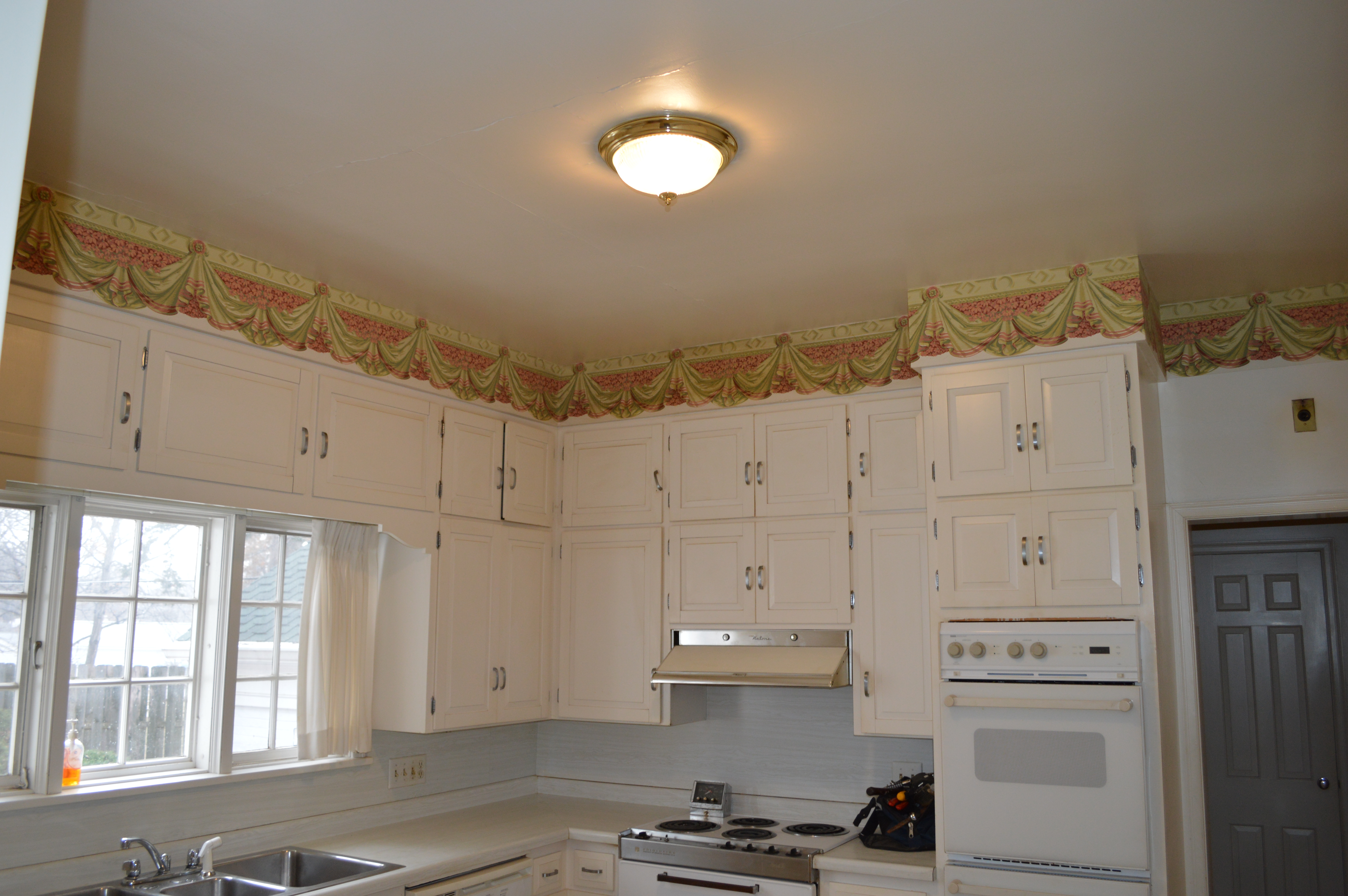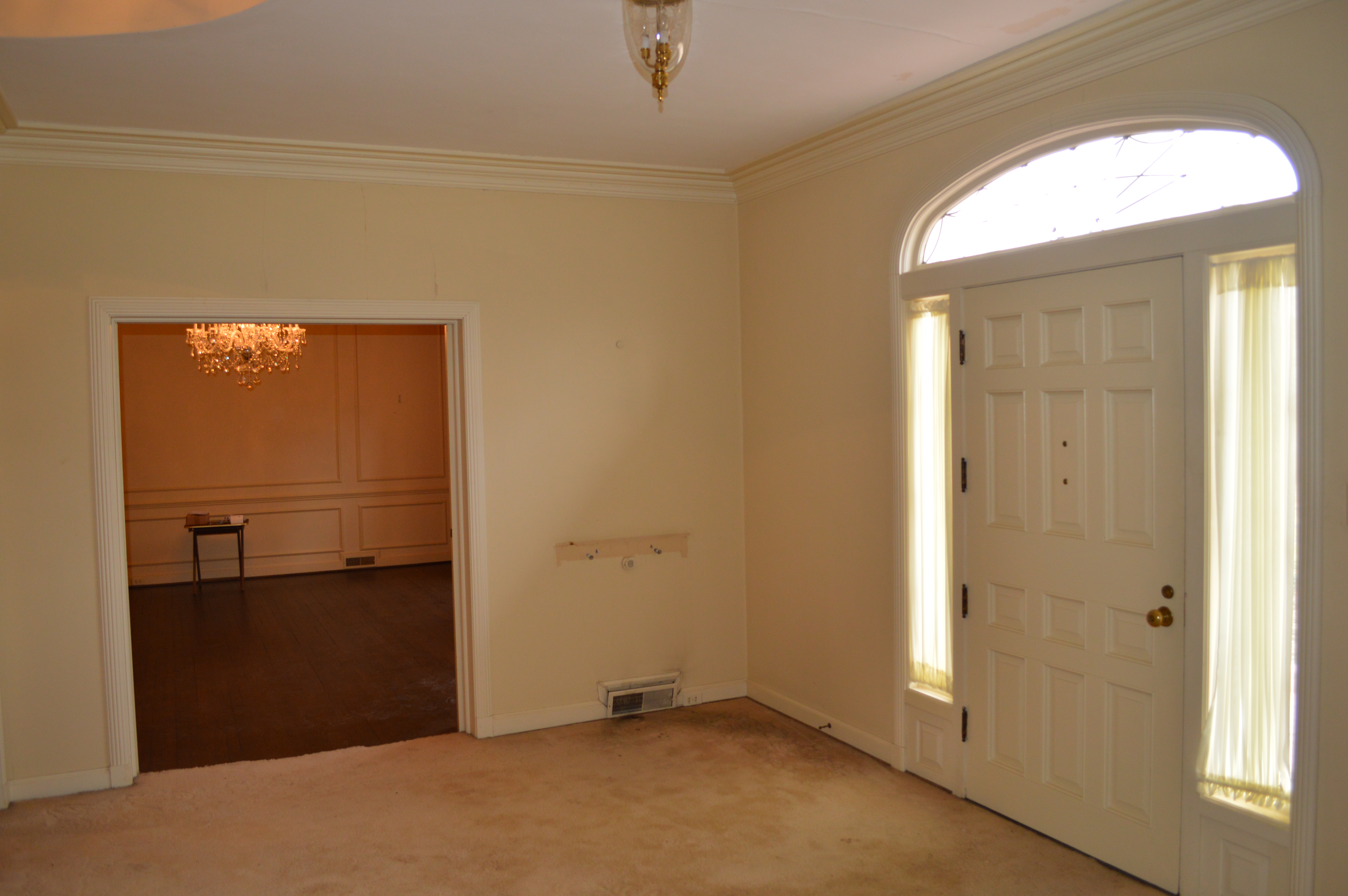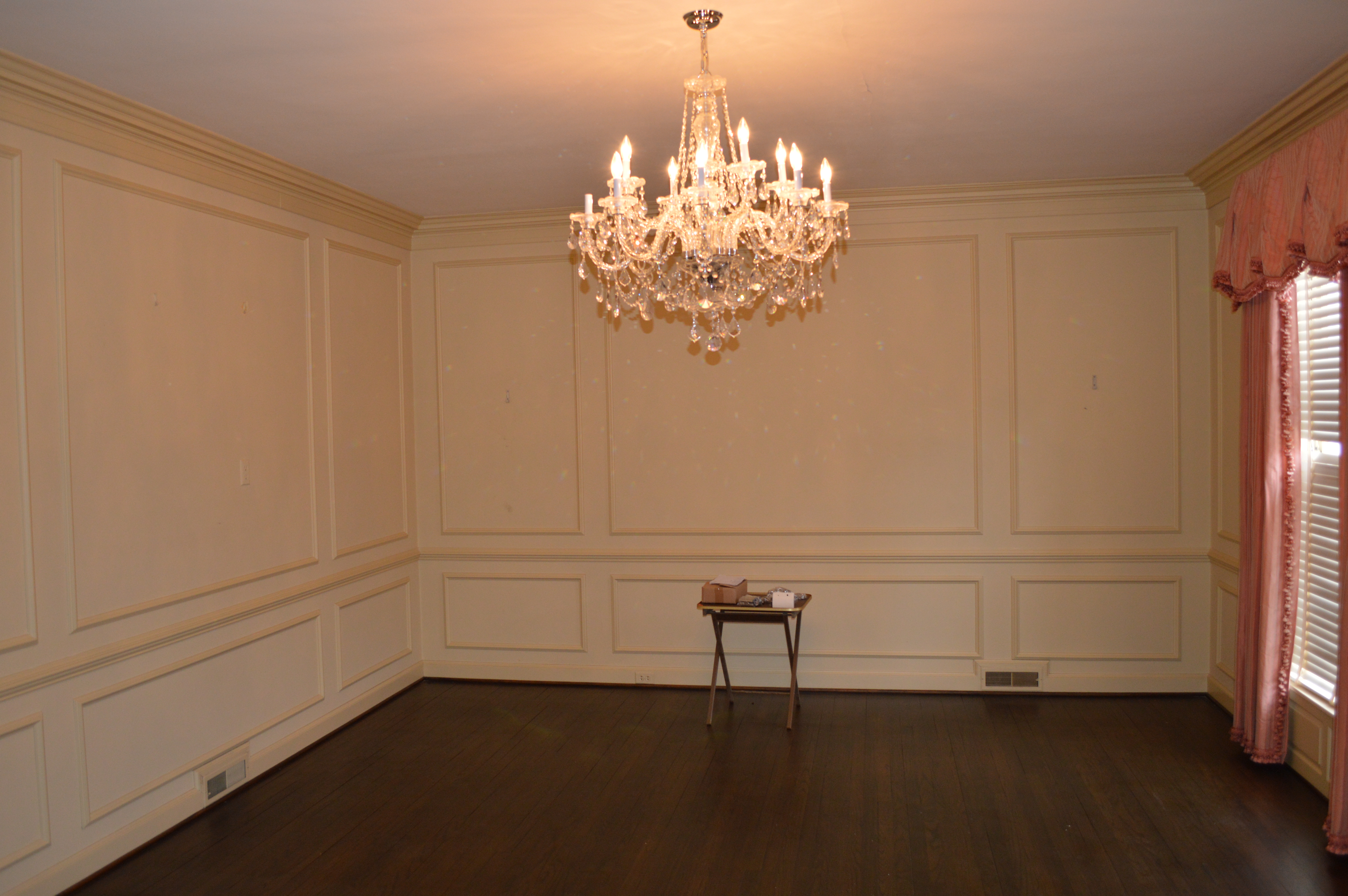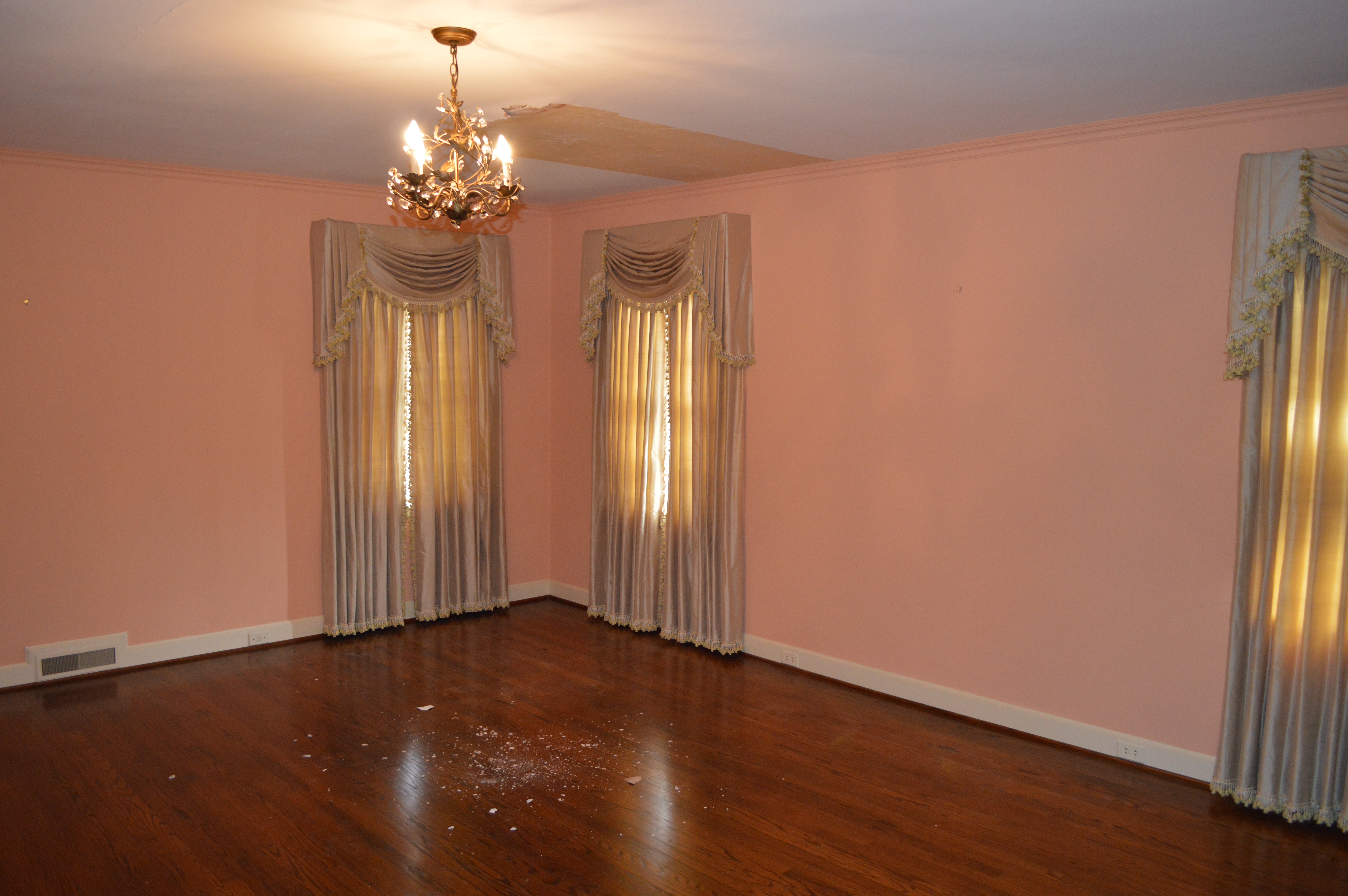 After the first day of demo, I made my way over to see the ‘progress’. There were several of the kitchen cabinets removed, but not much had changed. The second day I made the mistake of stopping by again, only to find the kitchen in complete shambles, dust filling the house and the chandeliers I had requested be covered . . . were not! It was quite a sad scene. The stately home that had been filling my dreams for months was now a complete and utter disaster, certainly not stately by any means. It was quite sad to see ‘her’ in that condition. I left the house feeling downright depressed. Is this house going to become what I have envisioned? What if we can’t take out the walls of the kitchen? Is that dust filled with ASBESTOS!?! Should we have reused the original cabinets? Oy Vey – my mind started to run away with me.