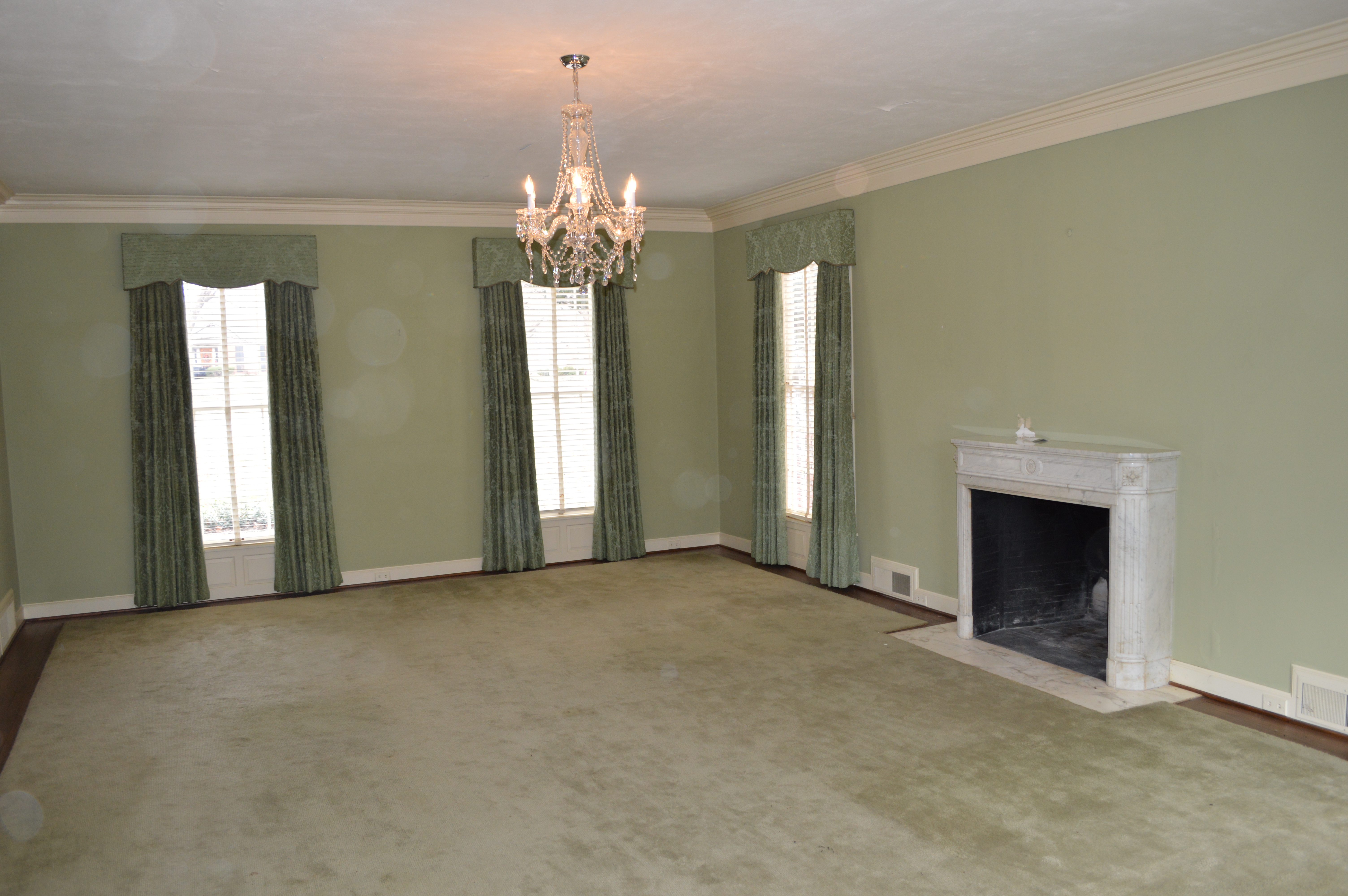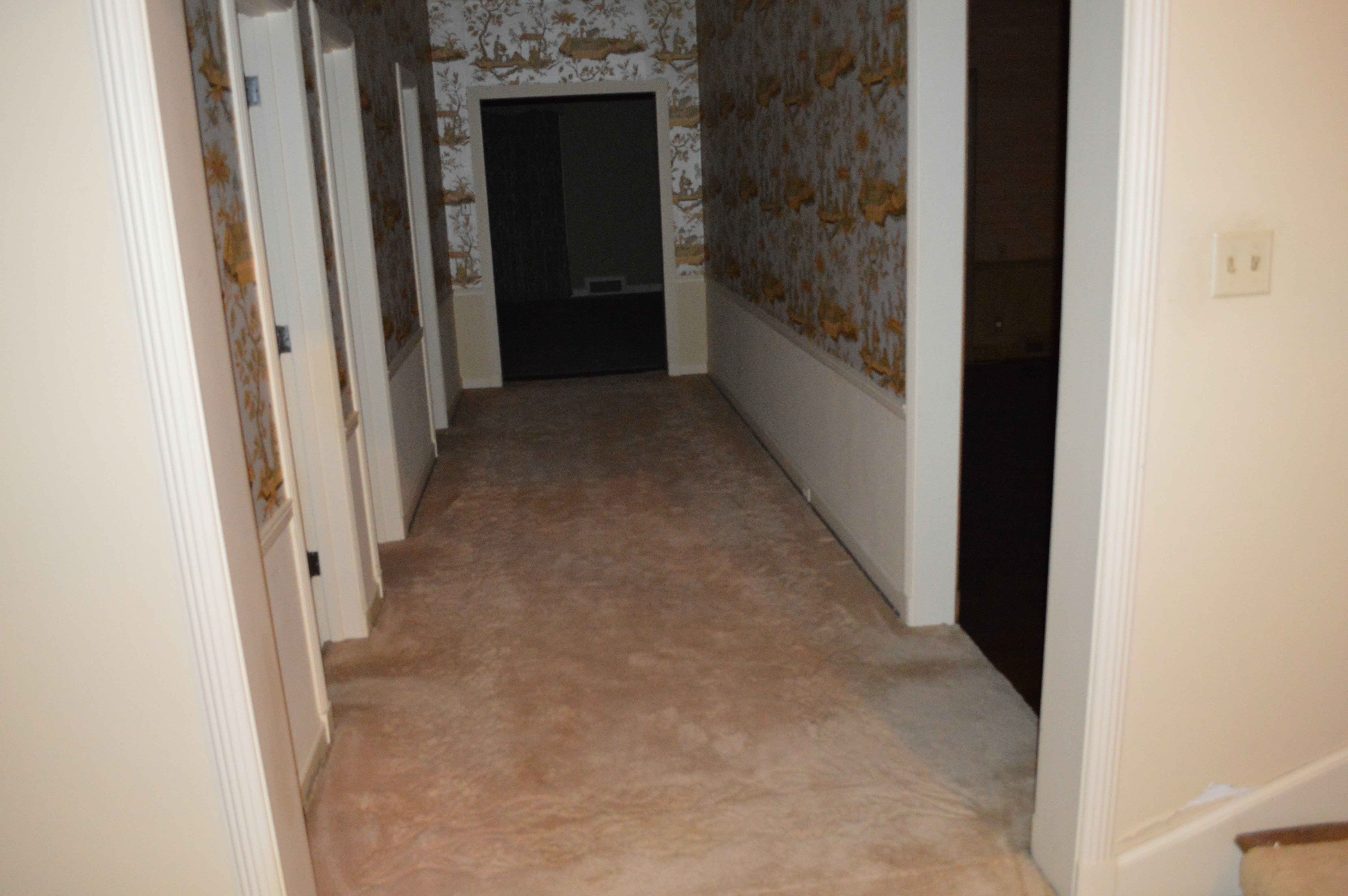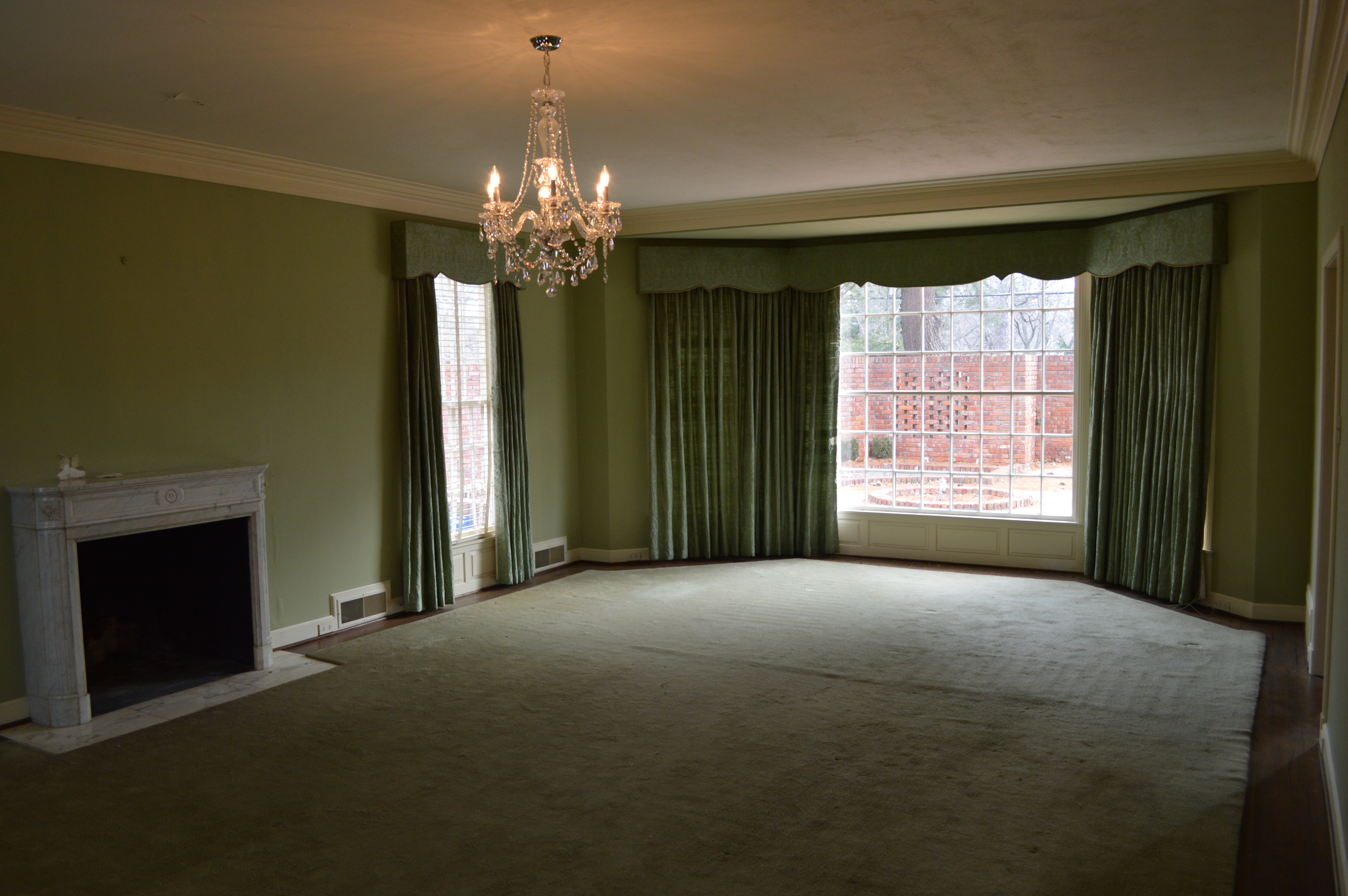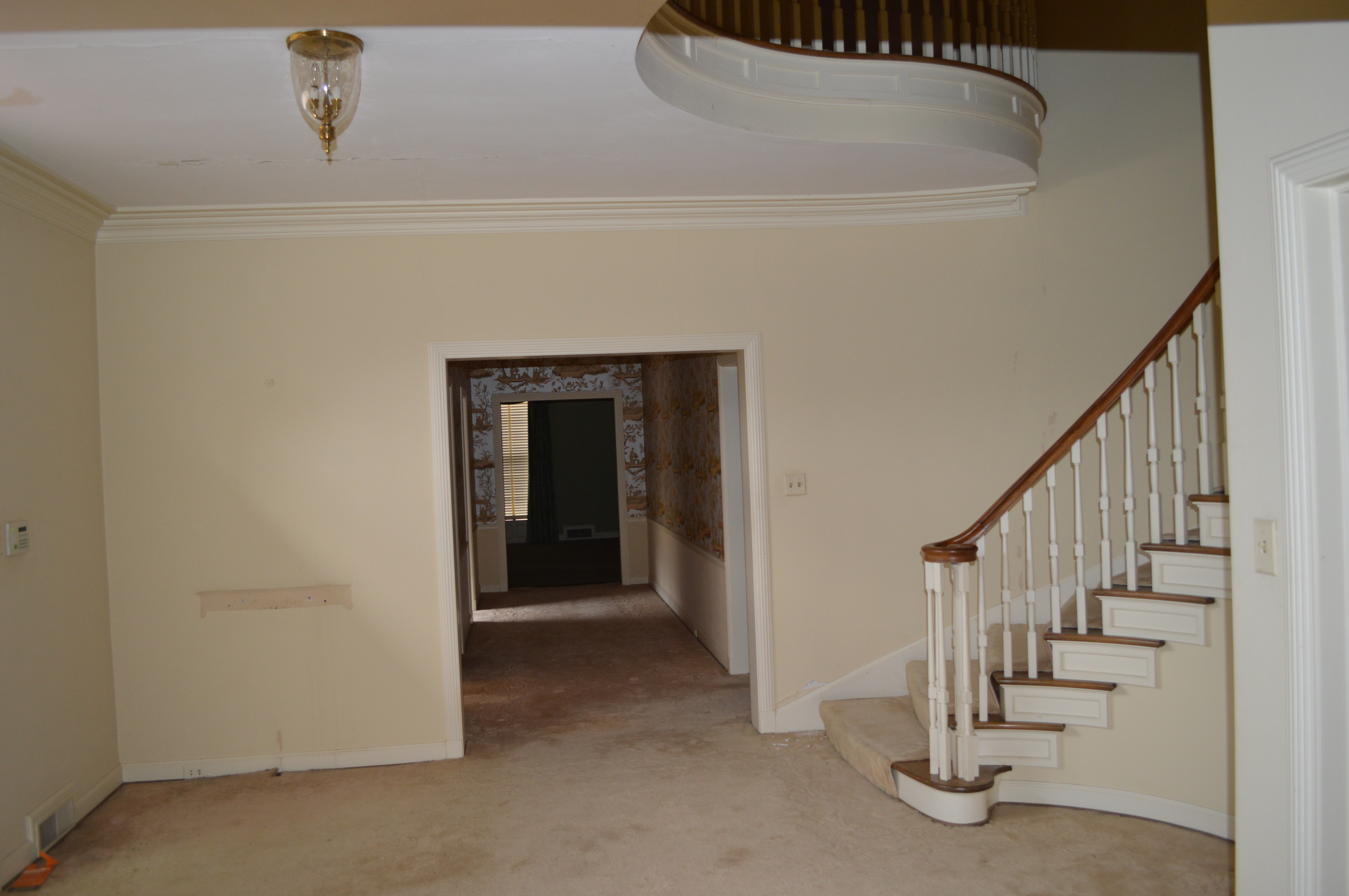 After the first day of demo, I made my way over to see the ‘progress’. There were several of the kitchen cabinets removed, but not much had changed. The second day I made the mistake of stopping by again, only to find the kitchen in complete shambles, dust filling the house and the chandeliers I had requested be covered . . . were not! It was quite a sad scene. The stately home that had been filling my dreams for months was now a complete and utter disaster, certainly not stately by any means. It was quite sad to see ‘her’ in that condition. I left the house feeling downright depressed. Is this house going to become what I have envisioned? What if we can’t take out the walls of the kitchen? Is that dust filled with ASBESTOS!?! Should we have reused the original cabinets? Oy Vey – my mind started to run away with me.